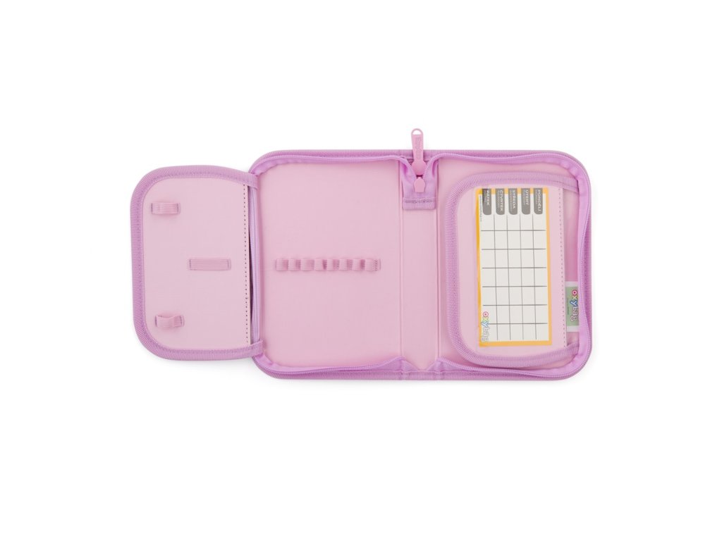 Egytáskás tolltartó két lezárással és gumipántokkal a tollak rögzítéséhez. Az belső lezárt részen átlátszó fólia található az órarend könnyű áttekintéséhez. A tolltartó nem tartalmaz betétet, hogy felkészüljön a kis iskolások kedvenc írószereire.
