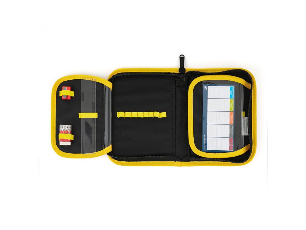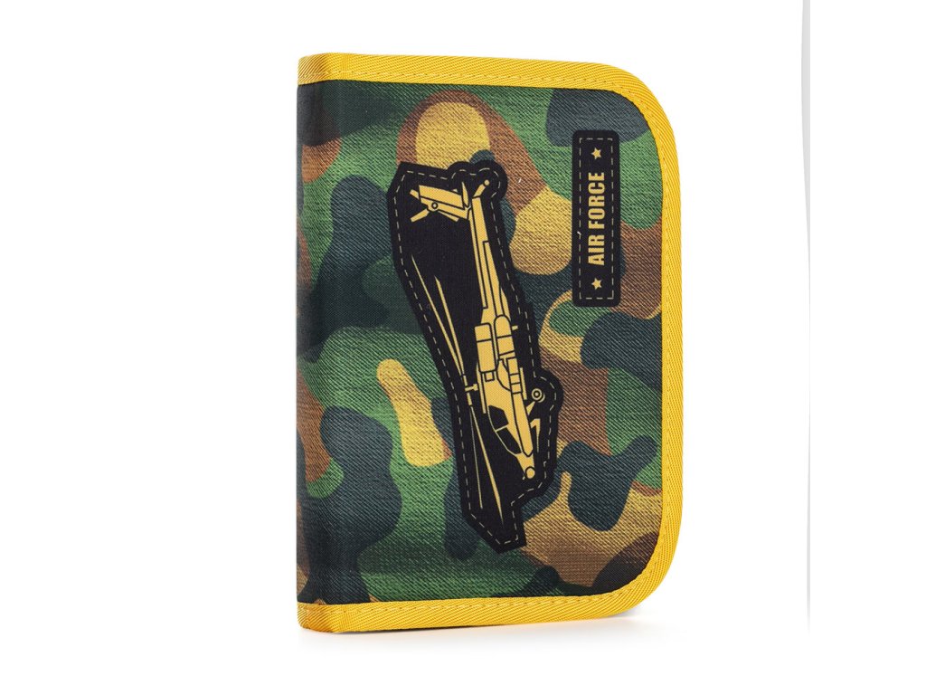 Egyszintes iskolai tolltartó 2 füllel, üres, 25 gumihurkot tartalmaz az írószerek tárolására. A belső szárnyakon átlátszó fólia található az órarendhez.