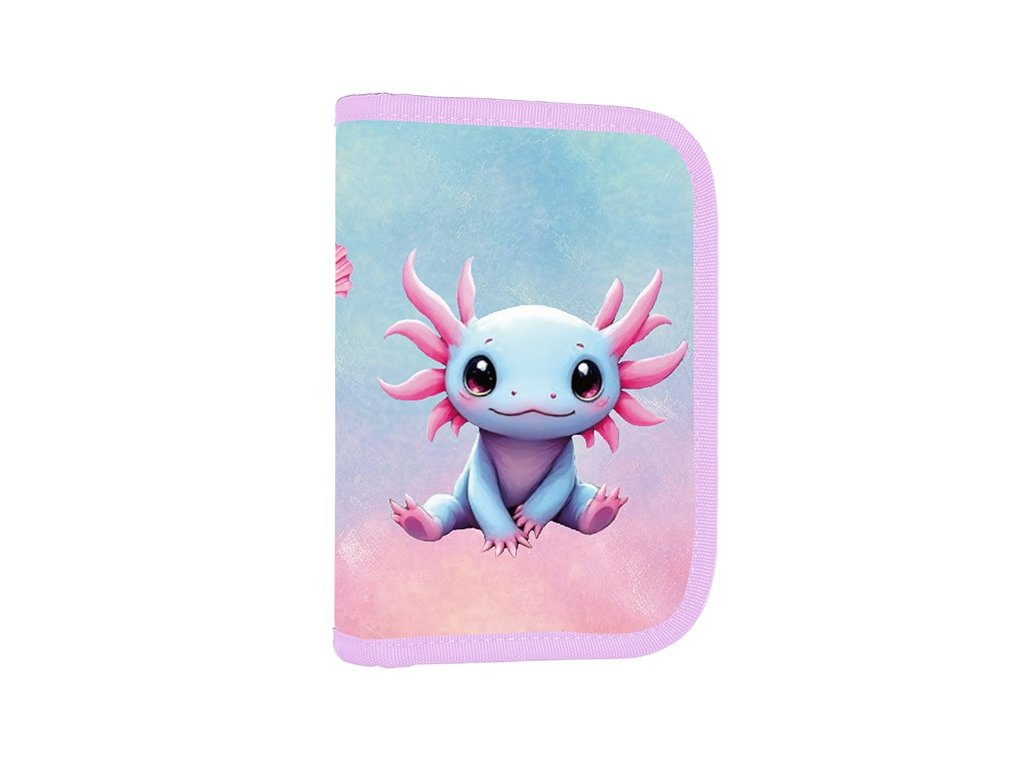 Egyrétegű tolltartó két fedéllel és gumipántokkal az írószerek rögzítéséhez.