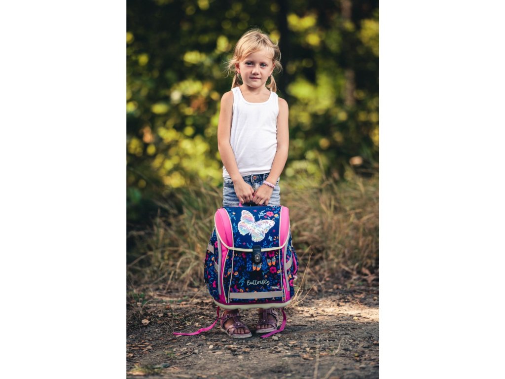 PREMIUM Light iskolatáska szett – Pillangó mintával, egyszintes tolltartóval és tornazsákkal.