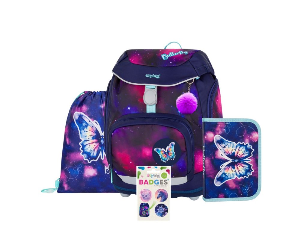 OXY Sherpy iskolai hátizsák egy szintű tolltartóval, váltócipő tasakkal és cserélhető kitűzőkészlettel.