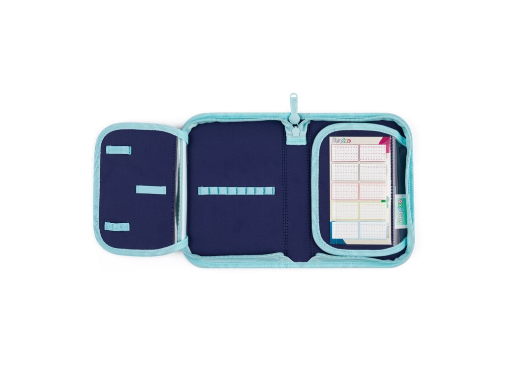 Két fedéllel és gumipántokkal a írószerek rögzítéséhez. A belső fedélen átlátszó fólia található az órarend egyszerű áttekintéséhez. A tolltartó üres, így a kisdiákok kedvenc írószereivel tölthető fel.