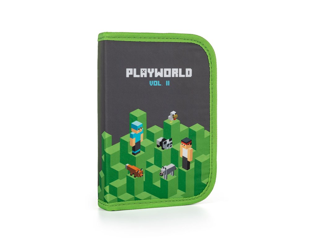 Egyszintes iskolai tolltartó 2 füllel, üres, 25 gumihurkot tartalmaz az írószerek tárolására. A belső szárnyakon átlátszó fólia található az órarendhez.