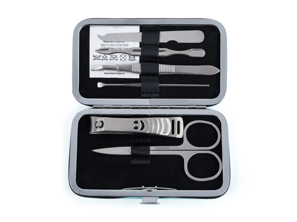 Utazó manikűrkészlet (6 db) – kiváló minőségű ezüst szett, amely ollót, körömvágó csipeszt, csipeszt, reszelőt, manikűrpálcát és bőrtologatót tartalmaz.