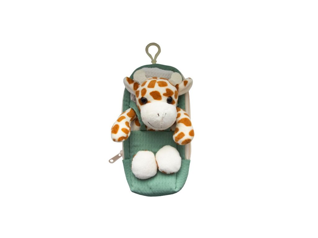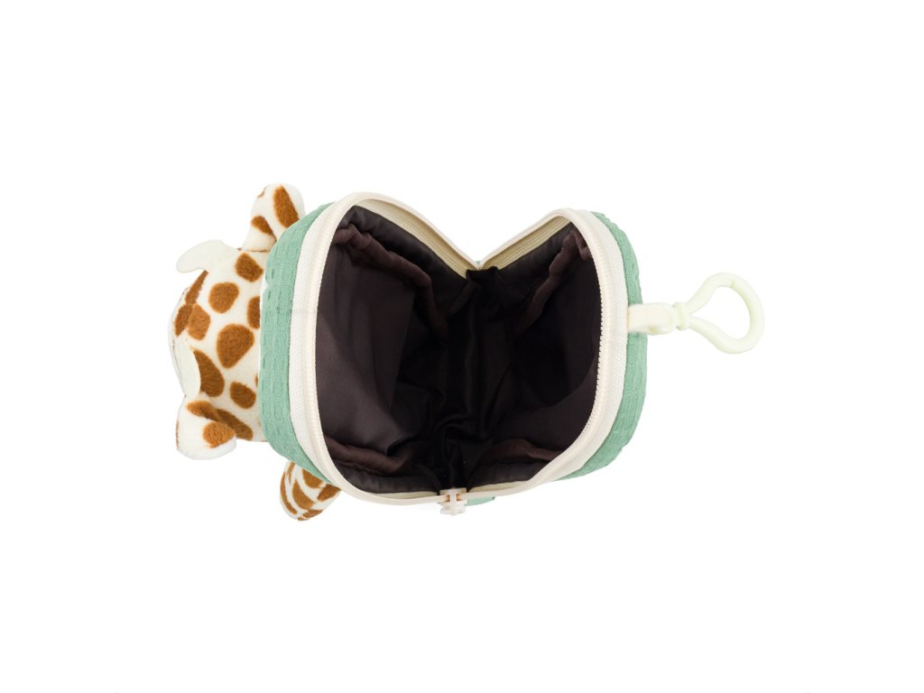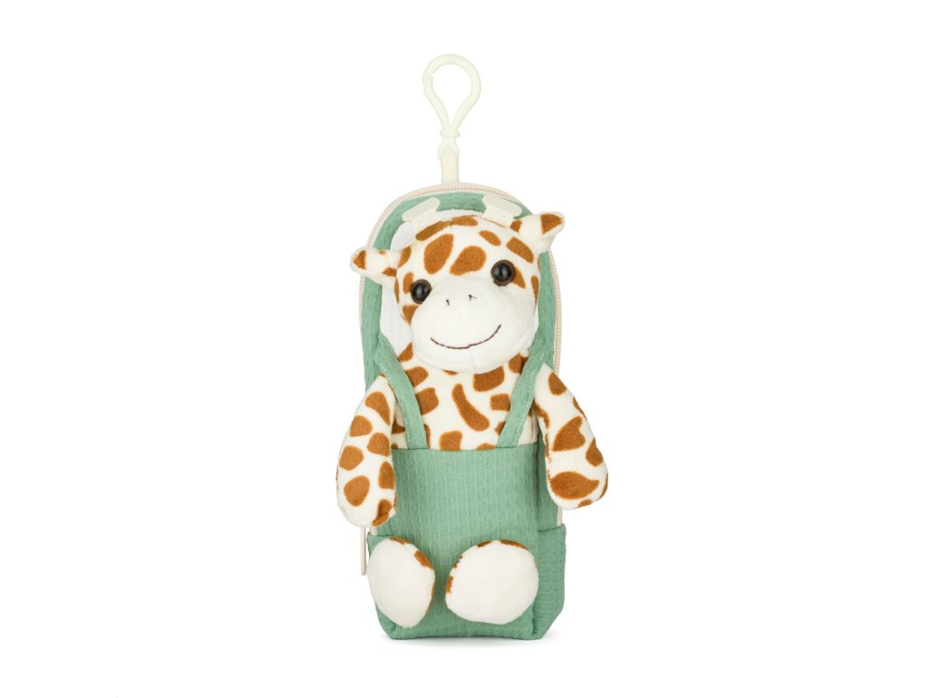 Az elején egy hímzett plüss zsiráf található, puha fejjel és lábakkal, így olyan hatást kelt, mintha egy kis plüssfigura őrizné a gyerekek minden kincsét. A tolltartó felül nyitható, és puha plüss anyagból készült, textil szövet kombinációjával.