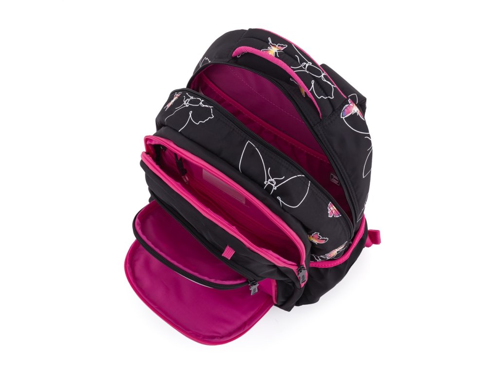 Anatómiailag formázott hátlappal, párnázott pántokkal, mellkaspánttal és rengeteg fényvisszaverő elemmel rendelkezik.