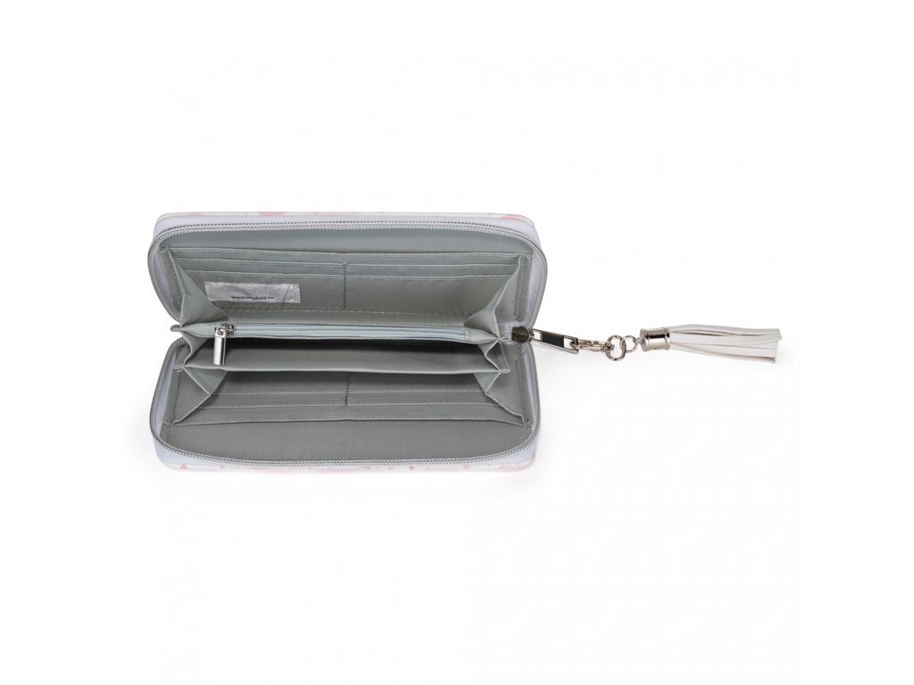 A pénztárca 8 hűségkártya-helyet és 2 nagyobb zsebet tartalmaz. Rendelkezik még 3 különálló rekesszel a készpénz elhelyezésére és 1 cipzáras zsebbel a kisebb érmékre.