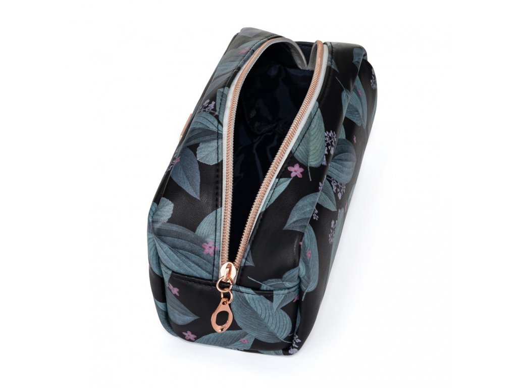 Kisebb utazási kozmetikai táska sötét kivitelben. Alkalmas apró piperecikkek és kozmetikumok tárolására.