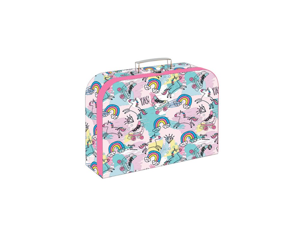 Gyerek laminált bőrönd. Praktikus segédeszköz gyerekeknek a rajzeszközök vagy olyan iskolai kellékek tárolására, amelyek nem férnek el az iskolatáskában.
