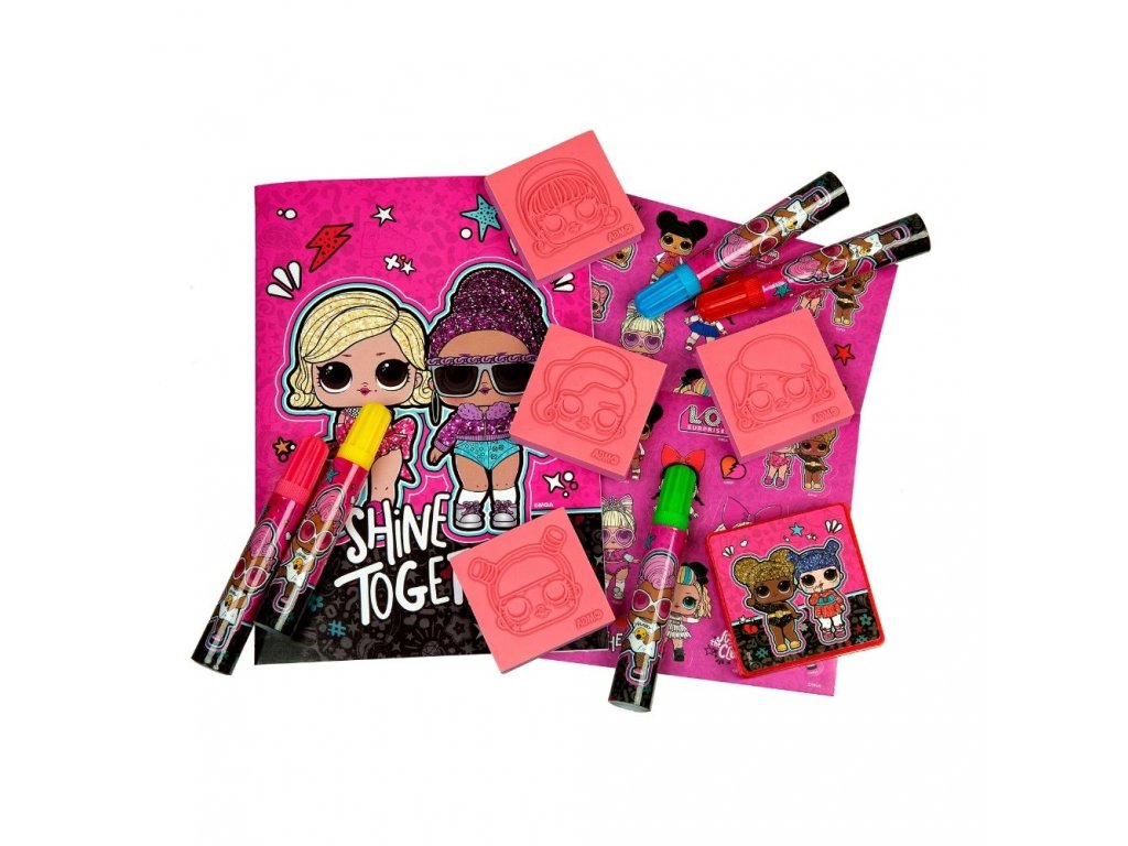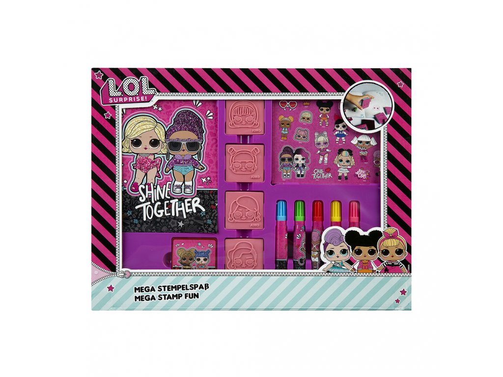 A szórakoztató LOL Surprise bélyegkészlet négy nagy bélyegzőt, egy tintapárnát, öt markert, egy matricalapot és egy kifestőkönyvet tartalmaz.